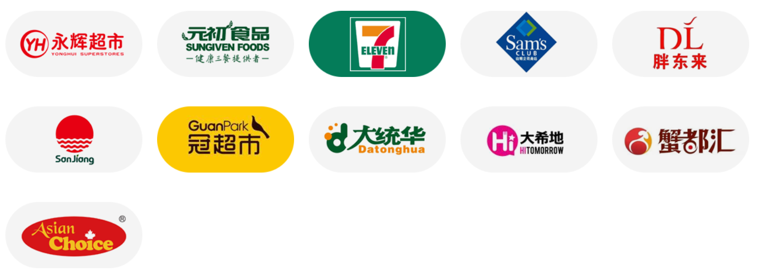 零售客戶:永輝超市、元初食品、7-11便利店、山姆大叔、胖東來、三江購(gòu)物、冠超市、大統(tǒng)華、大希地、蟹都匯、Asian Choice